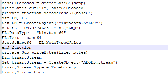 该VBS脚本通过Base64解码数据,解码后得到一个可执行文件,并将其写入%temp%/ihelp.exe