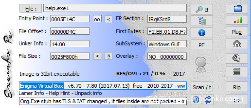 最终执行的木马后门是ihelp.exe,该样本使用Enigma Virtual Box加壳: