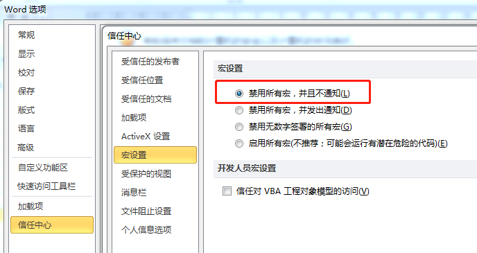 该组织很擅长社会工程学,通过向目标定向发送各类诱饵文档进行攻击,诱饵文档通常通过恶意宏来执行后续代码。相对于使用Office 0day,利用恶意宏进行攻击需要更多的用户交互以完成攻击。虽然这会降低其攻击的成功率,但可以通过更有针对性的邮件内容和更具迷惑性的文档信息来弥补。此外,这类攻击具有很好的成本优势,因此仍被许多攻击组织大量采用。企业用户应尽可能小心打开来源不明的文档,如有需要可通过打开Office Word文档中的:文件-选项-信任中心-信任中心设置-宏设置,来禁用一切宏代码执行:
