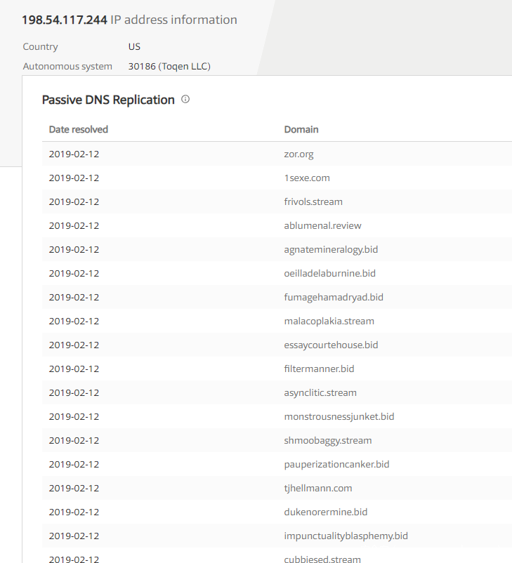 通过查询VirusTotal可以发现接管了C2域名的IP地址(198.54.117.244)绑定了大量的恶意域名: