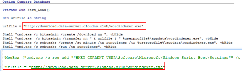 在本次诱饵文档提取的宏中,有段注释掉的木马下载地址(URL),与卡巴斯基曝光的Gaza cybergang活动中的宏脚本中的下载地址一致: