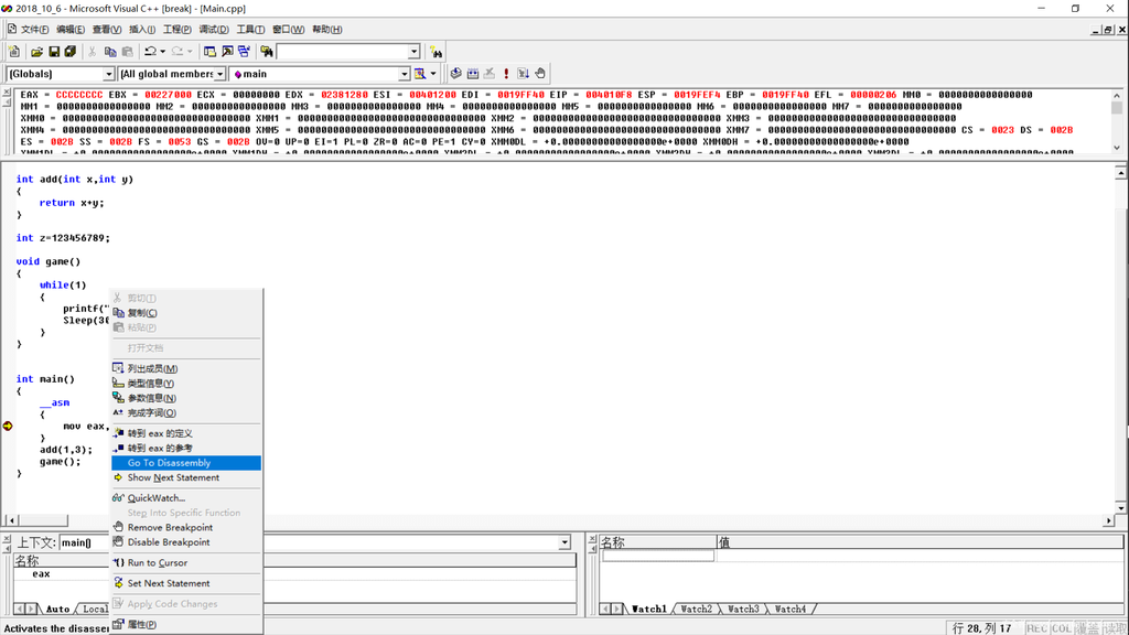 右键之后点击Go To Disassemble,也就是进入反编译界面,我们来看看反编译的代码