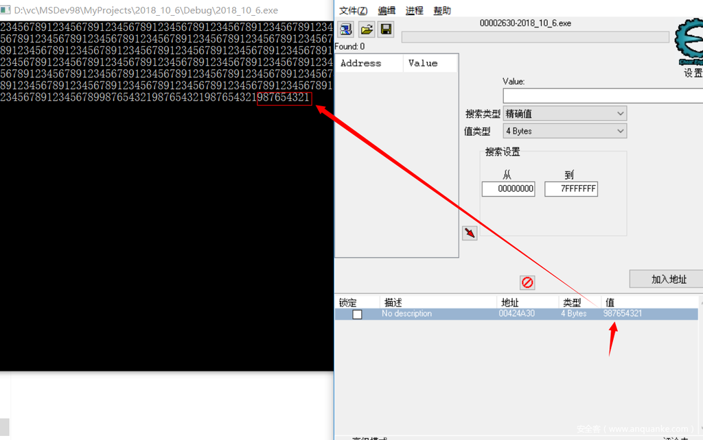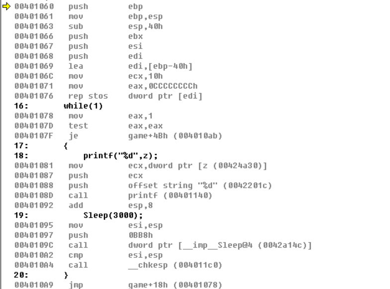 对于这里的堆栈就不画了,主要讲解一下这里的全局变量以及“基址”是啥,这里我们的全局变量z是由变量定义的时候分配指定的内存地址,在每一个函数中都可以找到,每一个全局变量都有一个唯一的内存地址,有且只有一个,在游戏外挂中经常会听到找“基址”,然而这个“基址”就是全局变量的地址,只要程序被编译那么就只有这么一个指定的地址,我们这个程序中z的地址[00424a30],打开CE