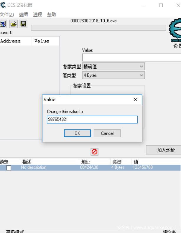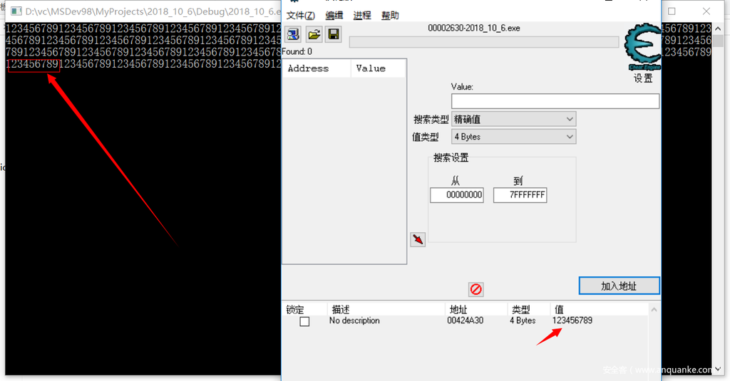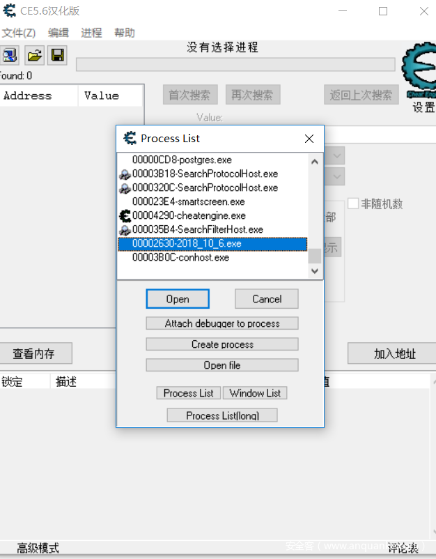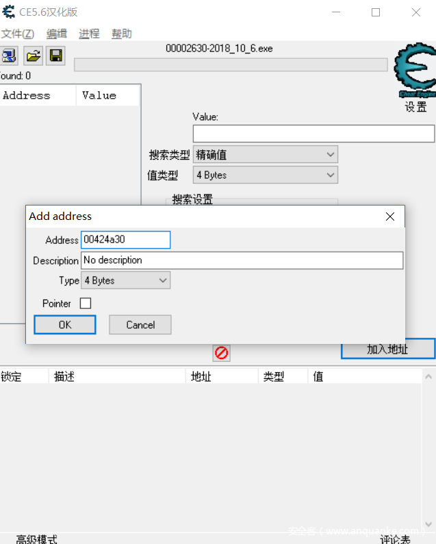 选择我们刚才运行的程序,点击加入地址,我们将00424a30这个内存地址加入进去