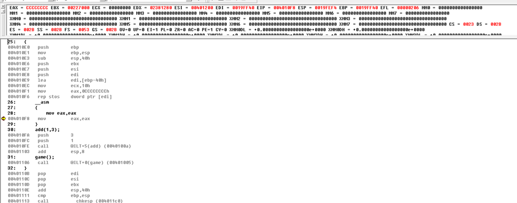 接着向栈中推入了ebx,esi,edi,栈顶指针[esp-Ch],然后lea指令将[ebp-40h]的地址放入edi中,给ecx赋值为10h=16,也就是循环16次又将0xCCCCCCCCh赋给eax,这也被称为断点字符,然后使用rep指令将缓冲区中的值赋值为0xCCCCCCCCh,现在我们再来看看堆栈中的变化