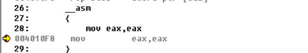 我们先写一句汇编代码,mov eax,eax其实这句代码并没有什么用,也就是将eax的值移入eax中,这句代码对于我们的作用仅作为断点,我们F5运行下程序并且切换到反编译界面