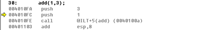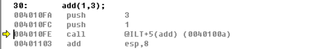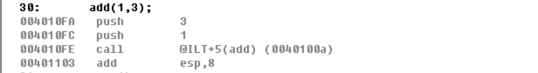 可以看到函数调用的时候首先是将3、1这两个值推入栈中,但是又有疑问了“add函数的调用是这样的add(1,3),为啥首先推入栈中的是3而不是1呢?”之所以这样是因为栈中是先进后出的,所以参数进入栈中的顺序是从右向左的,当然这里也可以看到函数中的参数是压入栈中然后取出来而不是通过通用寄存器eax,edx,ebx这些来传送参数的,其实这也好理解,因为通用寄存器只有八个,像esp,eip,ebp这样的寄存器还不能随便改,能用的也只有剩下的几个,参数超过剩下的几个咋办?那就只能用堆栈了。我们继续来看F10单步执行一下,看看堆栈的变化