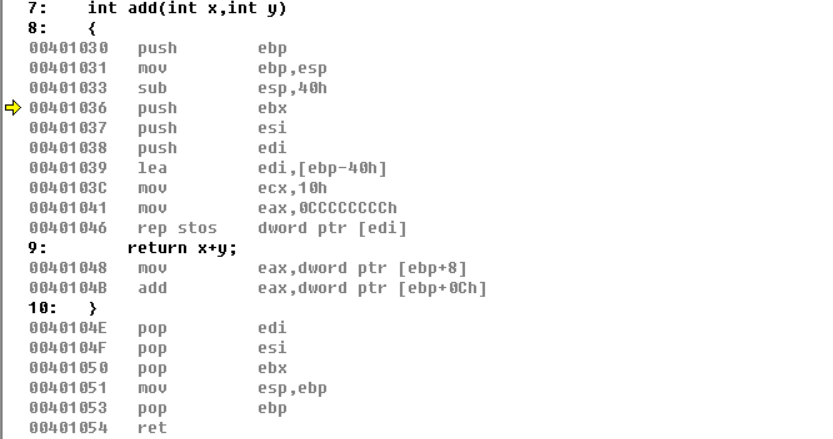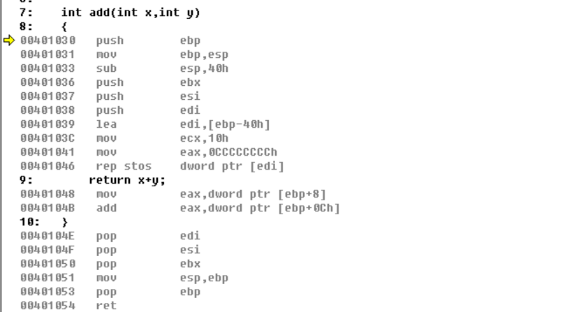 这里是我们自己写的汇编代码,编译器也没有改动过可以说是本色出演,这里内存没有变化,好,那么我们接着来看add函数这里的调用