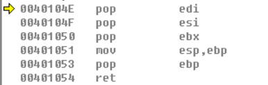 首先将edi,esi,ebx中的值取出来,这里可以看到,我们推入和取出的顺序刚好相反,先进后出的道理,随后将ebp的值移动到esp中,这里也就改变了栈顶指针,然后pop ebp,最后ret,ret的做的操作: