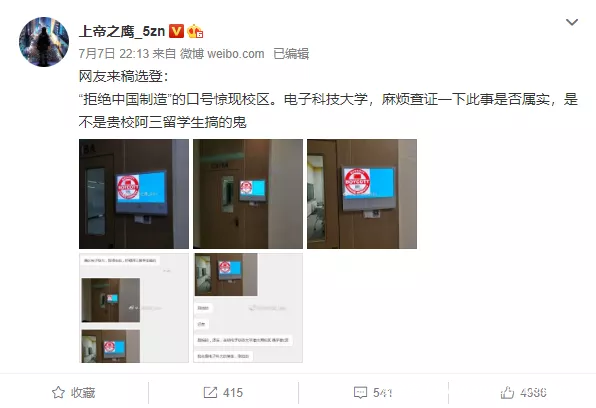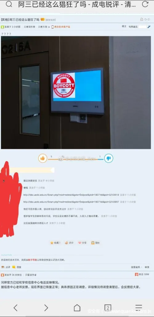 今日一个ID名为上帝之鹰的微博网友发布了一条微博,内容为:“成都电子科技大学清水河校区品字楼C区的教学楼显示屏上面出现了“给我离南亚远点,抵制中国制造”的字样,怀疑是阿三在校留学生搞的鬼? ”