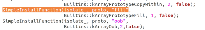 我们找到bootstrapper.cc文件,搜索SimpleInstallFunction(isolate_, proto, "fill",,发现下面已经将oob函数加入进去,patch成功。