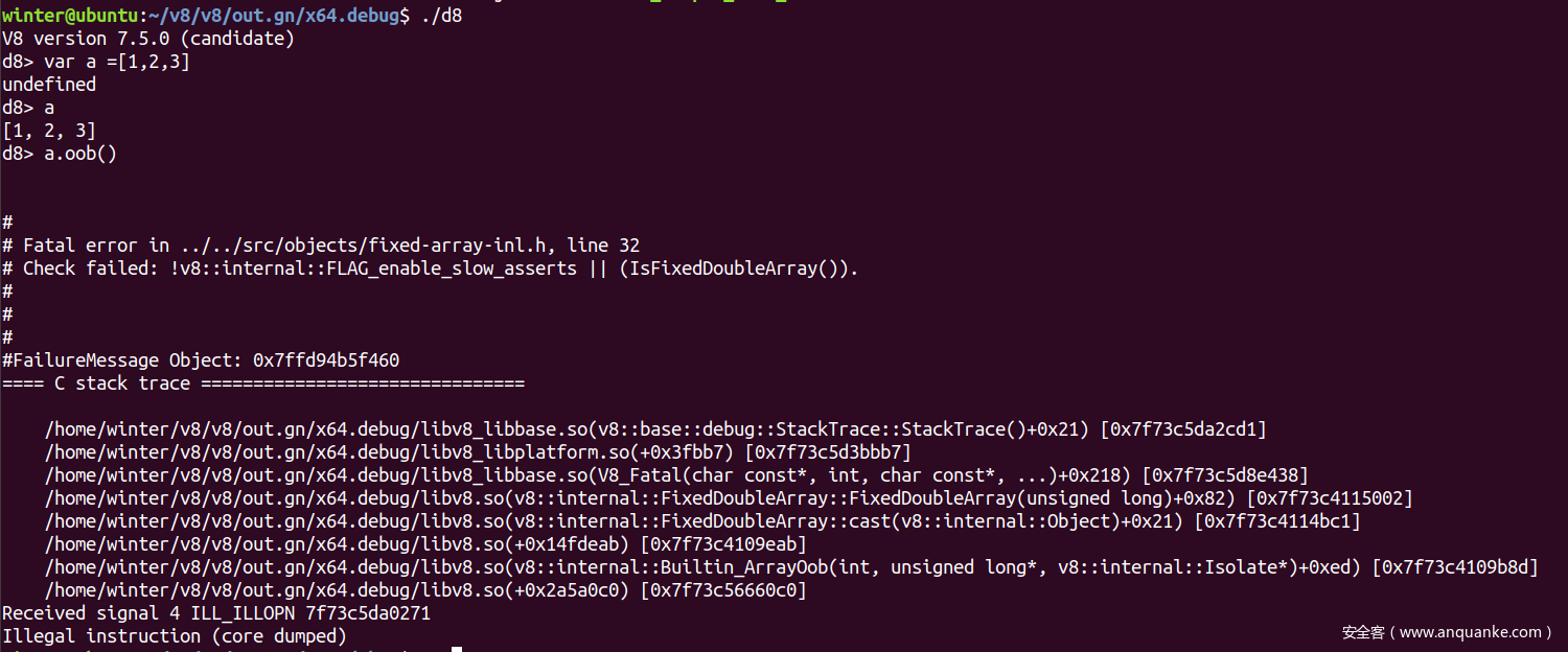 了解到是DCHECK宏的问题,然而对宏修改或是注释之后发现编译出来的d8执行还是会出现问题(这个时候已经开始怀疑人生了)。后来仔细的观察了一下师傅们写的文章,发现里面调试oob的时候都是用的release版本,之前也试过release版本的d8确实不会出现问题,所以很可能debug版本的d8就是不行,而别人文章里面出现的debug版本的d8的目的就是为了了解v8的数据是怎么存储的。所以这里正确的用法应该是用release版本进行调试,用debug版本来辅助分析。