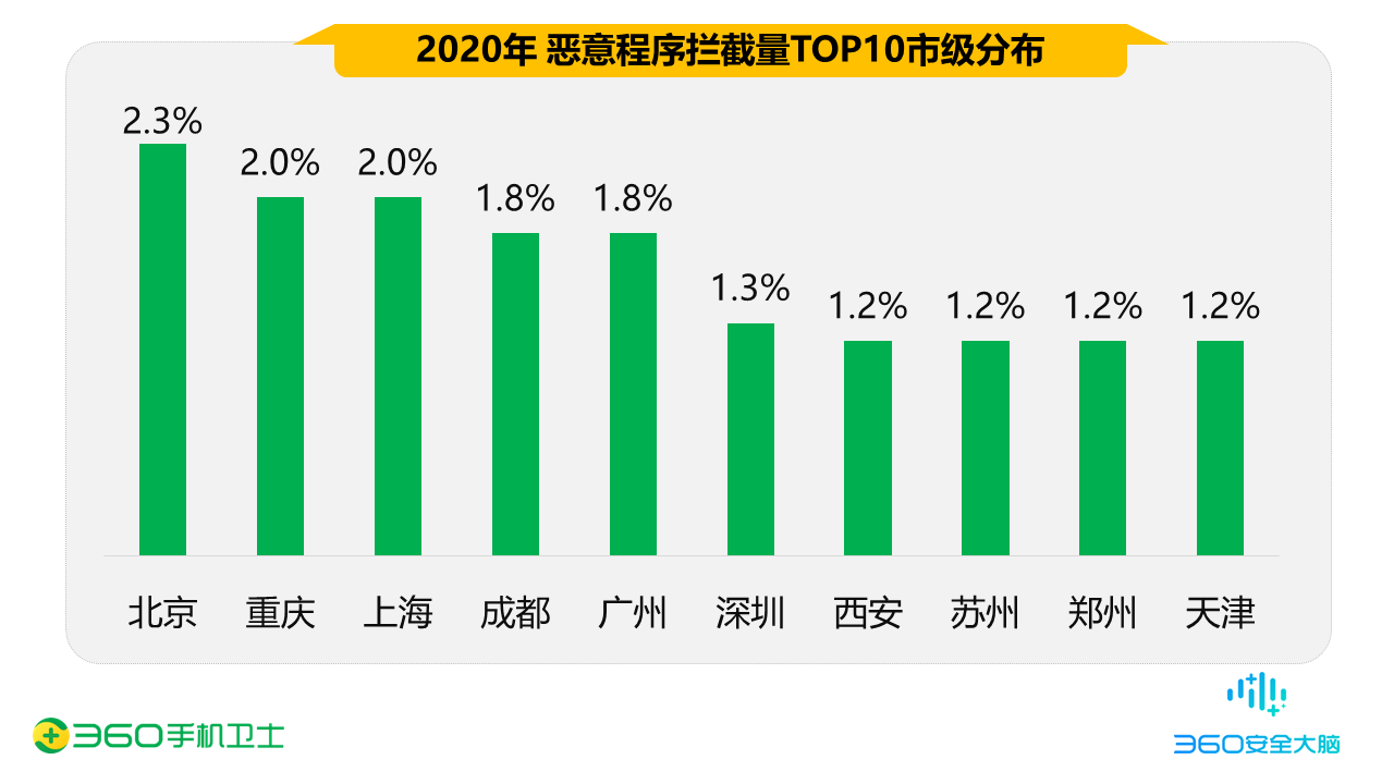 遭受手机恶意程序攻击的前五大城市中,除了北上广,还有重庆、成都两个新一线城市。