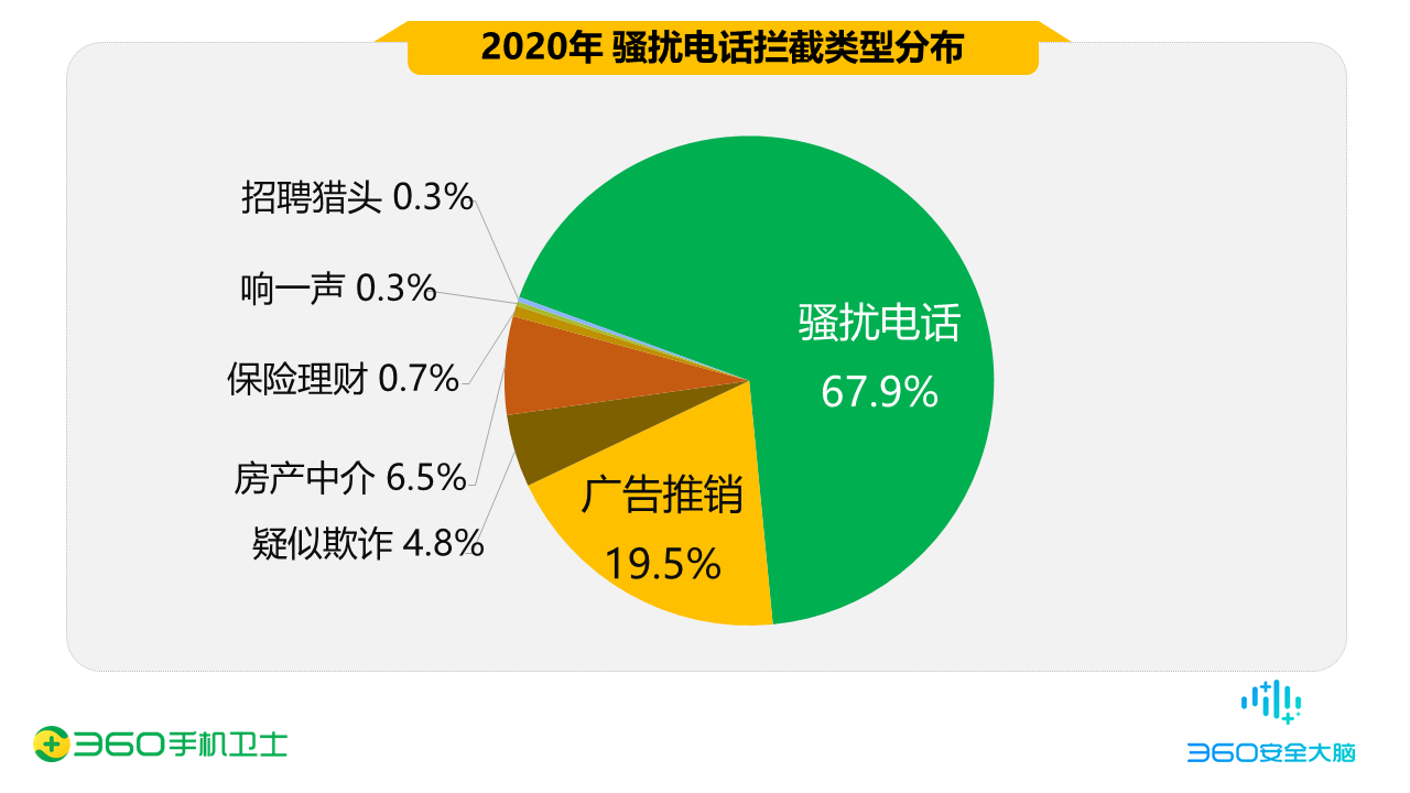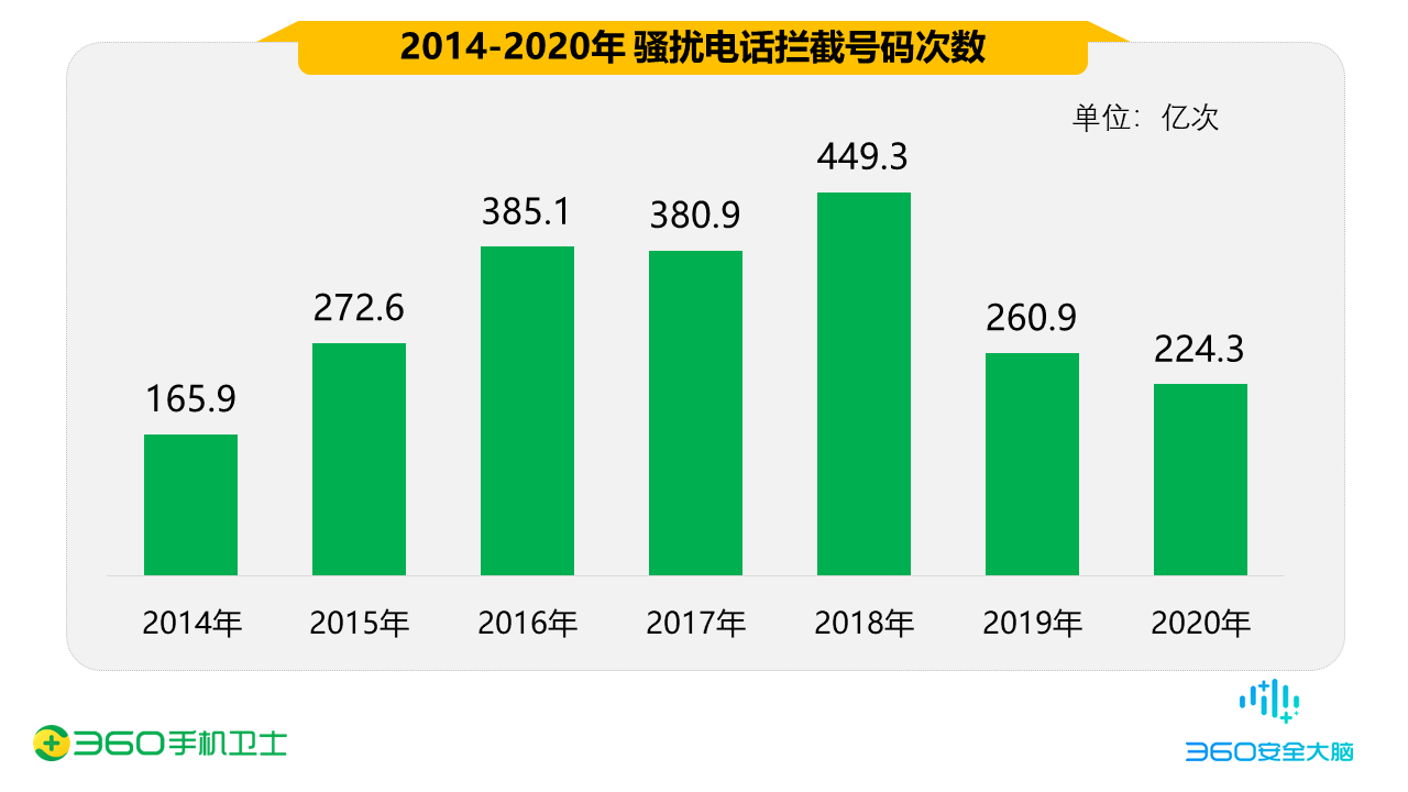 2020年,360手机卫士共为全国用户识别和拦截各类骚扰电话约224.3亿次,比2019年下降了14%。