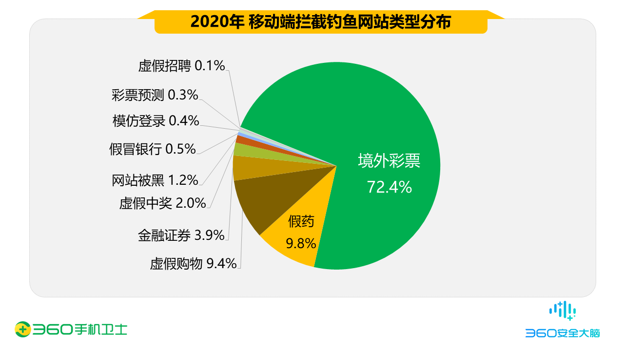 手机拦截钓鱼网站类型主要为境外彩票,其次为假药、虚拟购物。