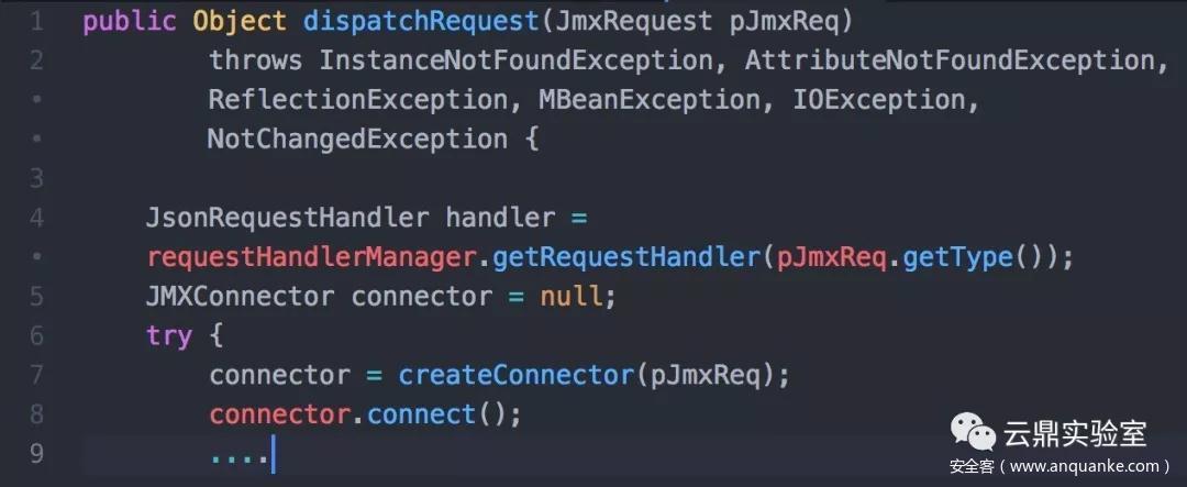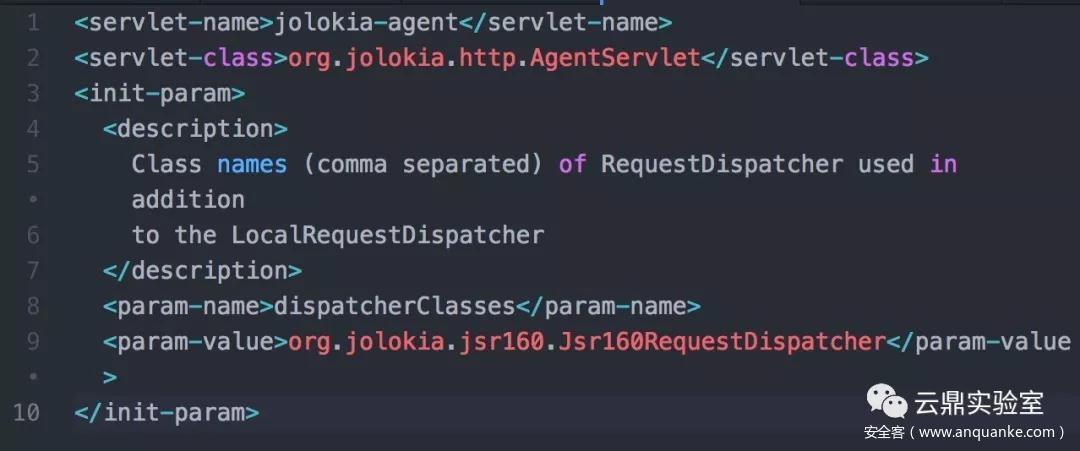 当 Web Container 将请求的交由 Jsr160RequestDispatcher 处理时,Jolokia Agent 创建连接,导致 JNDI 注入。在 WAR Agent 里,默认是由 Jsr160RequestDispatcher 处理的,这一点在 web.xml 也有体现: