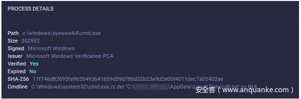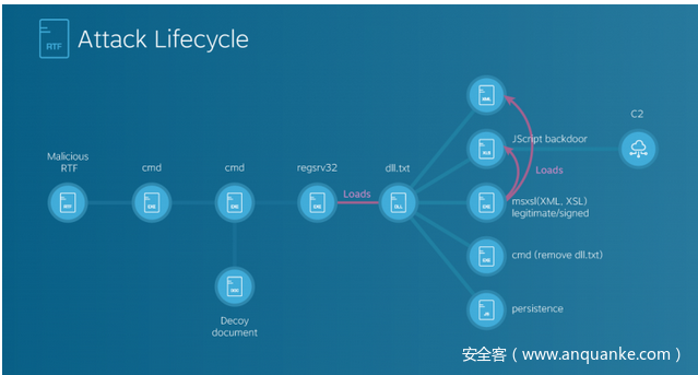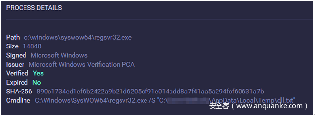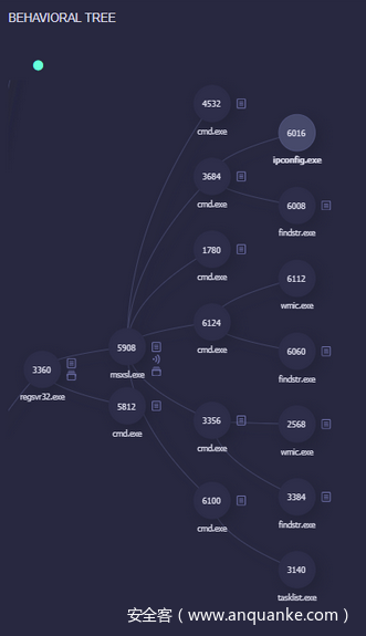 - cmd.exe实例使用DLL(dll.txt)启动regsrv32.exe,然后删除诱饵文档