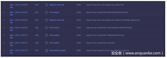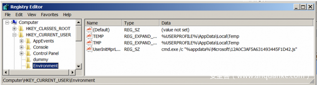删除c:usersuserappdataroamingmicrosoftmsxsl.exe executable, a Microsoft legitimate executable在HKCUEnvironment中创建一个注册表项值,其值为“UserInitMprLogonScript”,数据为Cmd.Exe /C “%Appdata%Microsoft12A0C3AF5A631493445F1D42.Js(用于登录持久性脚本. ATT&CK TID: T1037)