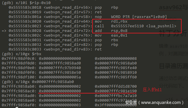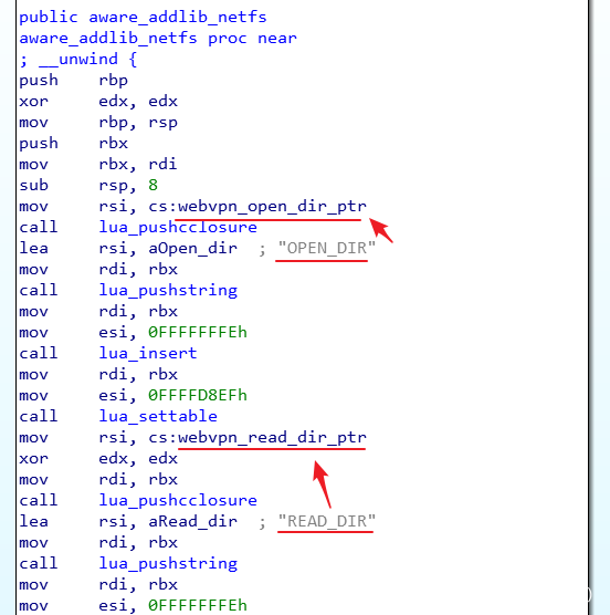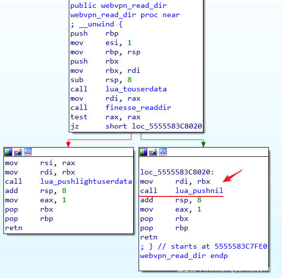 在查看对应的C函数时,在webvpn_read_dir()函数中,有一个对lua_pushnil()函数的调用。根据函数的调用顺序,猜测webvpn_file_name()函数中获取到的NULL值来自于这里。