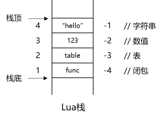Lua和C/C++通信的主要方式是一个虚拟栈,其特点是后进先出。在Lua中,Lua栈就是一个struct,栈的索引可以是正数也可以是负数,其中正数索引1永远表示栈底,负数索引-1永远表示栈顶,如下图所示。