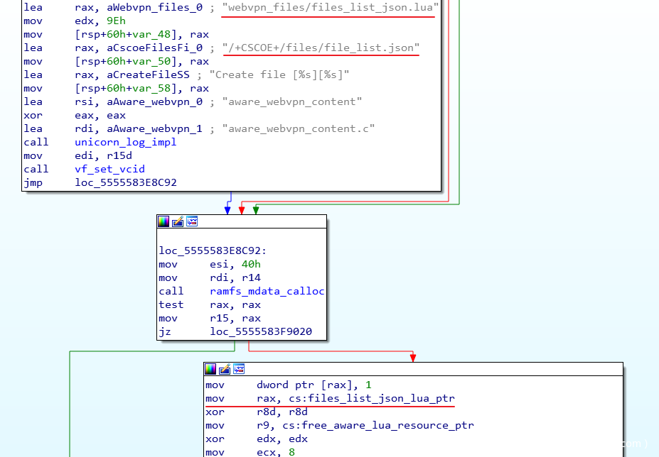 通过查找字符串/+CSCOE+/files/file_list.json的交叉引用定位到aware_webvpn_content()函数。在该函数中可以看到有很多请求url的字符串,同时还包含很多lua脚本的名称,猜测该函数应该是负责对这些请求进行处理,根据不同的请求url执行对应的lua脚本。示例如下。