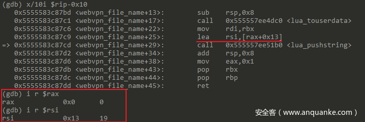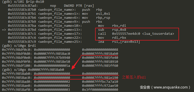 之后在webvpn_file_name()中调用lua_touserdata()函数前下断点,查看此时Lua栈上的内容,如下。此时,lua_touserdata()函数的第2个参数为1,即获取Lua栈底的数据,而此时栈底的数据为NULL。