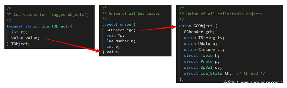 在Lua中,可以往栈上压入字符串、数值、表和闭包等类型,最后统一用Tobject这种数据结构进行保存,如下。TObject结构对应于Lua中所有的数据类型,是一个{值,类型}结构,它将值和类型绑在一起。其中用tt表示value的类型,value是一个联合体,共有4个域,说明如下。