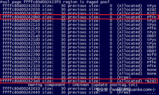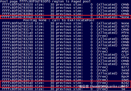 我们通过已分配的PfFk空间获得指向内核模块的指针,这些chunk与漏洞相关的pool chunk大小相同(0x30字节),因此我们经常能看到这些chunk共享同一个内存页面。