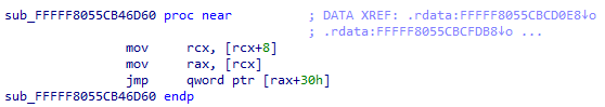 原始指针位于对象地址 + 0x10处,指向的是存储在BHDriver64.sys中的一个函数指针表(如图3所示)。由于我们有引用该地址的一条指令(如图5所示),因此可以使用相同的方法来计算该模块的内核模式映像基址。