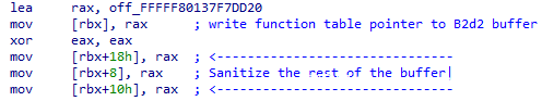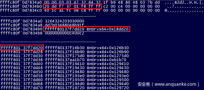 我们发现标记为B2d2的对象比较有趣,这些对象中包含指向另一个驱动(BHDrvx64.sys)的一个指针。此外,其中还包含指向函数指针表的一个指针,因此更值得研究。