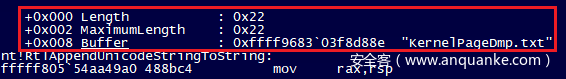 我们可以通过硬件断点来监控SEP对剩余对象数据的访问,检查调用栈后,我们发现在剩余数据被添加到对象内部时,nt!RtlAppendUnicodeStringToString函数会被调用。这个信息可以帮助我们回溯执行流,最终澄清这部分剩余数据为UNICODE_STRING结构体的长度(USHORT Length)及最大长度字段(USHORT MaximumLength),后面跟着指向实际Unicode字符串缓冲区的一个指针(PWSTR Buffer)。