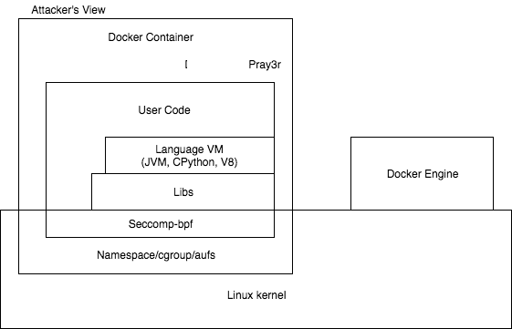 容器一共有7个攻击面:Linux Kernel、Namespace/Cgroups/Aufs、Seccomp-bpf、Libs、Language VM、User Code、Container(Docker) engine。