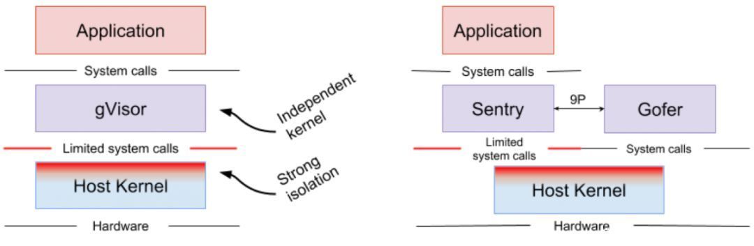 简单的说,gVisor是在用户态和内核态之间抽象出一层,封装成API,有点像user-mode kernel,以此实现隔离;Kata Container是采用轻量级虚拟机隔离,与传统的VM比较类似,但是它实现了无缝集成当前的Kubernetes加Docker架构。我们接着来看gVisor与Kata Container的异同。