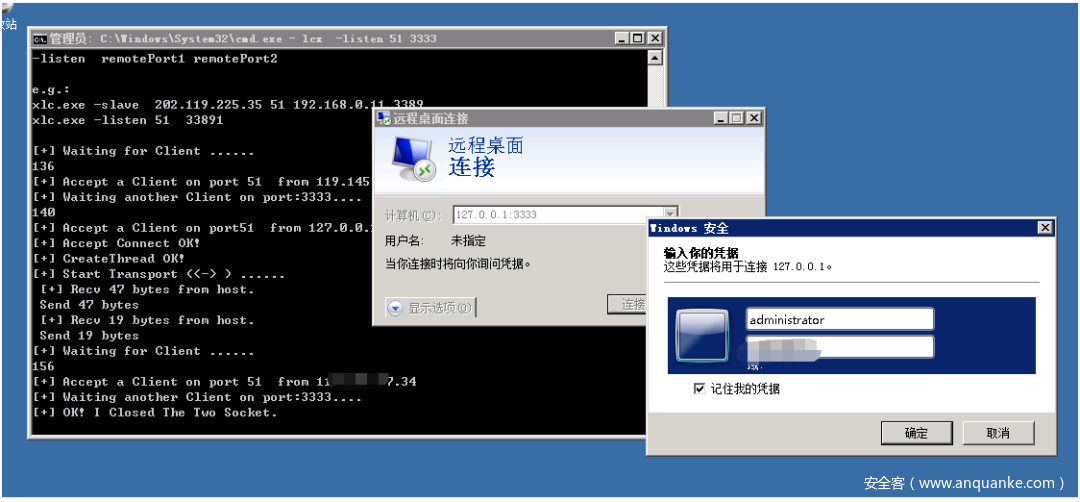 攻击者本地VPS监听 lcx -listen 监听端口(随便设置) 转发到本地的端口(随便设置,远程端口链接)