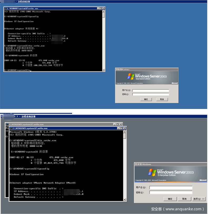 7.对当前不能登录的主机尝试五下shift键,发现已经有被入侵的痕迹,利用前人的路径,进入,获得明文密码E,再获取多台Windows2003机器