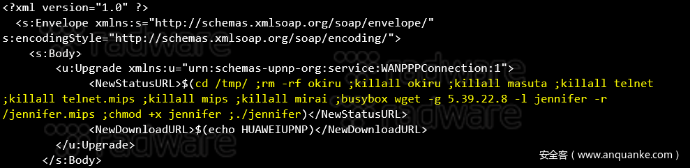 CVE-2017–17215所基于的漏洞利用代码会对目标主机端口37215发送POST请求(/ctrlt/DeviceUpgrade_),并使用一系列不同的命令序列在目标主机中下载并运行恶意软件。首先,它会尝试除掉当前主机中驻留的任何bot(如果有的话),这样可以避免出现资源竞争: