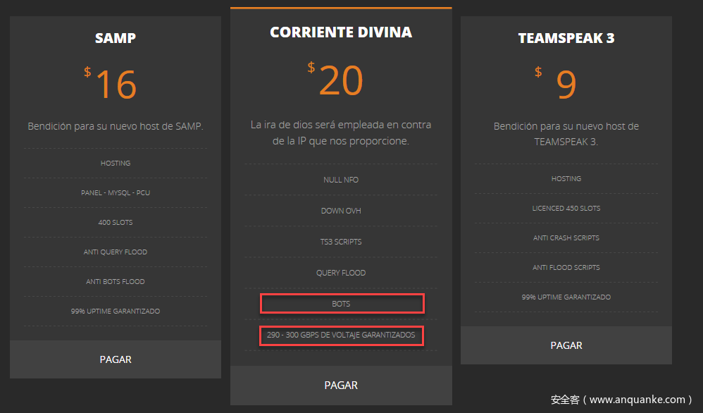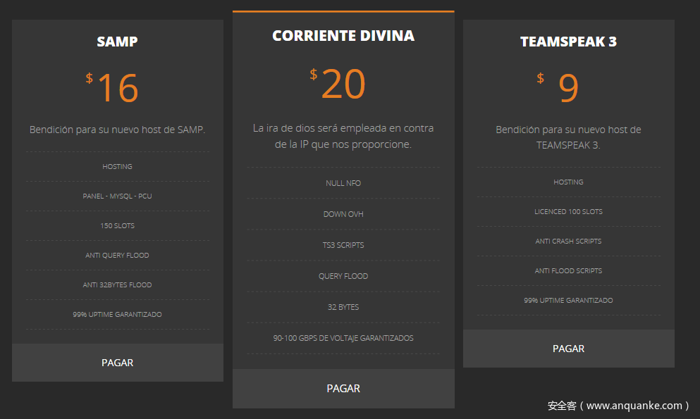 Corriente Divina选项被描述为“上帝的愤怒会降临到你所提供的IP地址身上”。也就是说,该服务可以对客户所提供的IP地址进行DDoS攻击,攻击带宽约为90-100Gbps,攻击向量包括Source引擎查询以及32字节泛洪攻击。TS3脚本以及“Down OVH”选项很可能指的是针对托管服务OVH(OVH是一家云托管服务提供商,并且从2016年9月份开始,这家服务商就一直受到了原始Mirai僵尸网络的攻击困扰)的攻击服务。需要注意的是,OVH同样可以给客户提供多游戏玩家服务器的托管服务(Minecraft),而它也是Mirai攻击的主要目标。