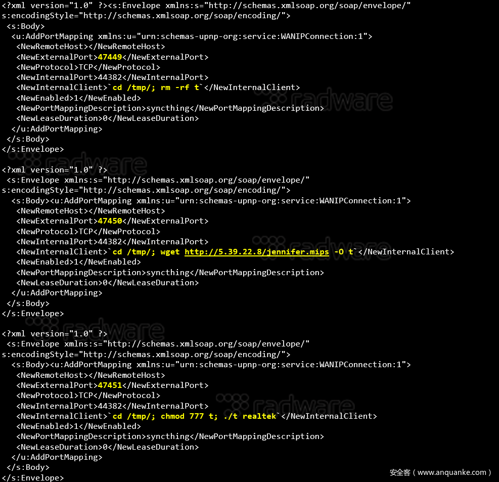 在2018年1月30号,我们的物联网蜜罐记录下了多个来自不同服务器的漏洞利用尝试,而这些服务器均位于欧洲地区多个不同的主机托管中心。其中,基于CVE-2014-8361的漏洞利用代码会尝试通过向目标主机端口52869发送三种不同的SOAP POST请求(使用URL/picsdesc.xml)来实现远程代码执行。