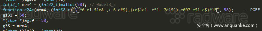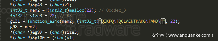 为了在不需要进行逆向分析的情况下,找到混淆算法和密钥,我们准备从上面这个有58个字符的字符串入手,具体请参考下图所示的C语言伪代码:
