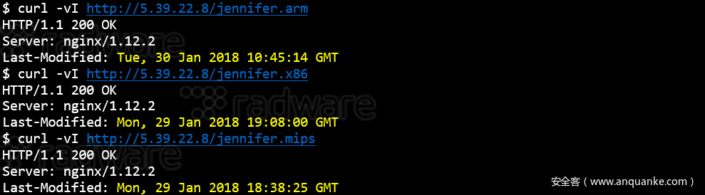 下载服务器托管了针对MIPS、ARM和x86的恶意代码样本,而且这些代码近期都被大量用户下载过: