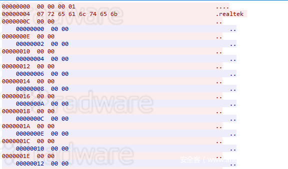 在运行过程中,恶意软件会跟硬编码的C2服务器建立TCP会话(端口127,主机名为‘skids.sancalvicie.com’),然后向命令行发送二进制初始序列“0x00 0x00 0x00 0x01 0x07”以及相应参数来运行恶意代码。在“Realtek漏洞利用”场景下,相应参数就是“realtek”了。下图显示的是bot跟C2服务器之间的TCP会话信息(红色部分为bot):