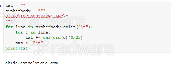 这里使用之前得到的0x45固定密钥并不能计算出我们所期望的结果,但是经过暴力破解攻击之后我们发现密钥0x22可以计算出C2服务器的主机名,即‘skids.sancalvicie.com’: