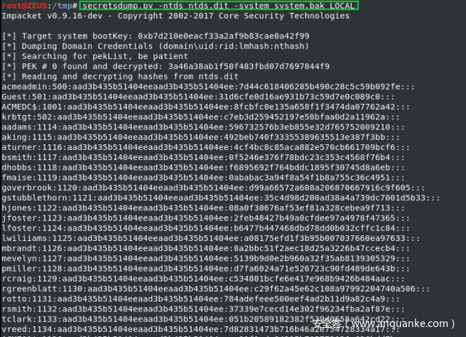 当我们成功从目标系统中提取出文件之后,我们将使用SecretsDump.py提取出NTLM哈希: