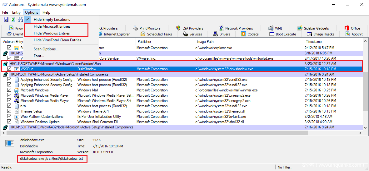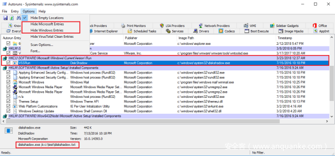 取消勾选“隐藏Windows条目”(Hide Windows Entries)之后,我们就可以看到AutoRuns注册表键信息了。