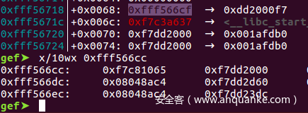 这里主要需要解决的就是如何将要改写的地址放在栈上。实现任意地址写需要依赖栈上存在一个链式结构,如0xffb5c308->0xffb5c328->0xffb5c358,这三个地址都在栈上。